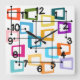 Den här väggklockan har en design av rektanglar som är tända på ena änden i groovy färg, orange, grönt, teal, lila, blått, rosa och gult med atomisk linjer som sprider dem.