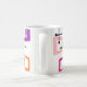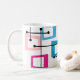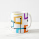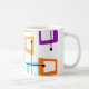 I mugg finns en rektangel som är utsträckt på ena änden i groovy färg, orange, grönt, teal, lila, blått, rosa och gult med isscrosande atomlinjer.