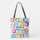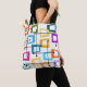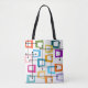 Den här väskan har en design av rektanglar som är sträckta på ena änden i groovyskade av orange, grönt, teal, lila, blått, rosa och gult med atomiskt linjer som sprider dem.