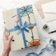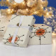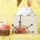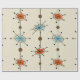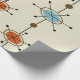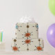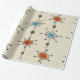 En vintage som har utmärkts till mitten av århundradet av modern abstrakt mönster med retrosputnik-stjärnor i bränd orange och himlar blue.