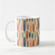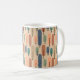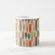 Mugg har ett modernt mönster i mitten av århundradet med långa ovaler i persikor, grönt, blått, teal och ljusbrun med svart linjer med cirklar på ändarna.