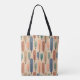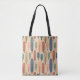 Den här väskan har en modernt design i mitten av århundradet av långa ovaler i persikor, grönt, blått, teal och ljusbrun med svart linjer med cirklar på ändarna.