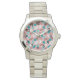 Denna kvinnoklocka har en modern atomdesign av ovala konturer i mitten av århundradet med små cirklar på dem och ovaler av solid färgad inuti dem.