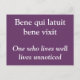 Ett lila vykort med en latinsk fras och den engelska översättningen under. "En som lever väl lever obemärkt", av Ovidius.