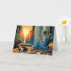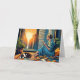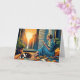 Söt tecknad bok knullar stil kvinna sitta i ett stadsöppningsfönster som håller ett kaffe kopp tittar ut över stadens skyscraper när sol stiger medan katten klämmer vid henne. Jag önskar dig en fredlig vänskap för familjemedlemmarnas kort.