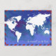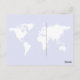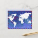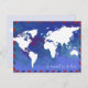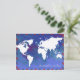 Vit värld-karta på blå bakgrund, med flygpost-ram och citat: "Att resa är att leva