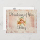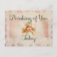 Vintagens utseende och stil-postkort från snöre och en liten flicka med blommor och en bonnet.