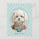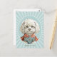 Bichon Frisé hund bär en blå superhjältedräkt med orange och texten "Thinking of you". Både mittbilden av hund och texten på framsidan kan ersättas med ett eget foto och en egen text eller lämnas som den är. Underbar vykortskonst för hundälskare.