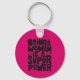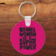 Nyckelkedjan för rundknappar har roligt på shock rosa bakgrund. Nyckelkedjor gör minnesvärda gåvor för familj och vänner eller skapar för dig själv.