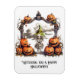 En bakgrund av moln och pulserande orange pumpor. I centrum av allt finns det en söt liten häxa med en potisthatt och en lömsk tom stare som är mer söt än skämtsam. Pumporna är väl placerade runt henne, med hjälp av vänligt sinnade ansikte som kastar ett mjukt, flimrande ljus på hennes magiska värld.