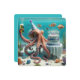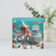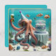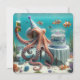 En bläckfisk med en party som håller en öl och sitter bredvid en födelsedagskalas under vatten. All text kan ändras.