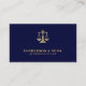 Simple minimalist lawyer attorney at law navy blue and gold business card with scales of justice logo, QR code, and modern typography. Suitable for a law firm, professional legal practitioner, judge, solicitor, or consultant.