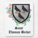 St. Thomas Becket (1120-1170) levde och dog före heraldry- åldern och hade inget jackande av arm under sin livstid. Hans arm sägs ha tillskrivits. På ett heraltorrt språk beskrivs hans arm som "argent, three choughs right, two and one", dvs. tre naturligt färgad rödnäbbade tuggar på en silver (eller vit) fält som är arrangerade med två fåglar på översta raden och en på grund. Armen visas tidigast c. 1400 om en monumental på taket för en av Canterburys katedralstrare. + Vid första anblicken verkar det vara ett märkligt val att blazon av St. Thomas tillskrivna jacka av arm. Thomas var inte Norman Cornish och Londoner är inte ett förnekande av Cornwall. + Det finns två möjliga förklaringar: kantering och förklaring. Kantering av arm är en visuell lek på ord, som vanligtvis slår på innehavarens namn. Canting arm var oerhört populärt hos Normans. I Norman-Fransken avser ord "en liten fågel", som hosten. I själva verket används ord och chough ofta på ett utbytbart sätt. Enligt legenden flög en kråka in i Canterbury Cathedral när Becket ljög dö. Kråkan gick igenom och tittade runt i magen och vred ben och slog rött. Den röda näbben och den röda ben är det som skiljer den korniga hoven (Pyrrhocorax pyrrhocorax) från andra medlemmar av kråkan (Corvidae), särskilt från den alpina hostan (Pyrrhocorax graculus). Det bör noteras att en liknande ursprung-talang för hostens utseende förekommer i artritlegenden. + Det finns inga specifika växter eller blommor som är associerade med St. Thomas på samma sätt som löven och blommorna från ash träd är associerade med St. Etheldreda (q.v.). Vi har valt att försköna våra örtartade plagg för St. Thomas med Canterbury Klockor av skäl som borde vara uppenbara även om blommorna inte fördes in i England förrän 1597 och brukade kallas Coventry Klockor. Canterbury Klockor (Campanula medium) har elegant, klockformad blomning i rosa, ro, lavender, blått eller vitt. På blommornas språk står de för tacksamhet, erkännande och skyldighet. + Image Kredit (Jackat av Arm): Saints_Alot; (Canterbury Klockor): Loose, original antique botanical print from Edward Step’s Favorite Flowers of Garden and Greenhouse (London och New York: Frederick Warne & Co, 1897), vol. 3, s. 159, vänd mot s. 330, från formgivarens privata samling av ephemera.