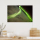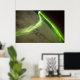 Aurora Australis som observerats från Internationell Space Station Bland jordens astronauter ombord på Internationell Space Station (ISS) är en av aurorans mest spektakulära. Dessa ständigt skiftande visningar av färgad rosett band, gardiner, strålar och prickar är mest synliga nära nord (aurora borealis) och syd (aurora australis) poles som laddade partiklar (joner) som strömmar från Sol (den soldrivna vinden) interagerar med jordens magnetiska fält. Medan auroran i allmänhet bara syns nära polerna kan allvarliga magnetiska stormar som påverkar jordens magnetiska fält föra dem mot ekvatorn. Denna slående bild av auroran togs under en geomagnetisk storm som med största sannolikhet orsakades av en koronal massavstötning från Sol den 24 maj 2010. ISS placerades över södra Indiska oceanen på en höjd av 350 kilometer (220 sjömil), där astronaut-observatören troligtvis tittar mot Antarktis (inte synlig) och Sydpolen. Auroran har en ojämn bandform som separerar till dedikerade prickar nära bildens nedre hörn i högerna. Den dominerande färgen på auroran är grönt, men det finns svaga förslag på rött lämnat i bildcentrum. Täck molntäcket är svagt synligt under auroran. Jordens horisontell (extremiteten) är tydligt synlig, liksom den ljusblå linjen i den övre atmosfären direkt ovanför den (i bildens övre centrum). Flera stjärnor visas som ljusa prickar mot mörkret i bildens övre höger. Auroror inträffar när joner i solcellen kolliderar med syre- och kväveatomer i den övre vinden. Atomerna är upphetsade av dessa kollisioner, och de avger normalt ljus när de återgår till sin ursprungliga energinivå. Ljuset skapar den aurora vi ser. Det vanligaste färg i auroran är grönt, som orsakas av ljus som avges av exciterade syreatomer vid våglängder centrerade med 0,558 mikrometer, eller miljondelar av en meter. (Synligt ljus reflekteras från friska (grönt) vegetabiliska löv vid ungefär samma våglängd.) Röd aurora genereras av ljus som avges under en längre våglängd (0,630 mikrometer), och även andra färg som blått och lila observeras ibland. Registrera till Rebates för FREE och spara 12 % på alla zazzelbeställningar förutom en registreringsbonus på 5,00 USD Alla reserverade Höger; utan förutfattade meningar, regressrätt eller meddelande (U.C. 1-308) http://en.wikipedia.org/wiki/File:Aurora_Australis_From_ISS.JPG "Aurora Australis" "aurora borealis" "magnetiska fält" "solceller vind" "internationell space station". rymden "aurora" för näastronomi "magnetisk storm"
