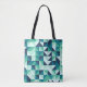 Den här bilden är en abstrakt geometrisk mönster som består av upprepade kvadratiska enheter, som var och en är indelad i trianglar och schevronformer med nyanser av teal, akva, mynta och marinblått. Designen skapar en känsla av rörelse och rytm, där de vinkelformer som visas flyttas och ordnas om över stödrastret, vilket resulterar i ett dynamiskt, vinklat utseende.