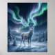 En lugn auroradjur står i en tyst arktisk glänta under en himmel levande med norrsken. Dets eleganta horn förvandlas till flödande band av smaragd-, blå- och violett ljus och smälter sömlöst in i den lysande himlen. Omgiven av snötäckta träd, avlägsna berg och reflekterande is utstrålar scenen frid och andlig skönhet. Detta förfinade konstverk kombinerar realism med vilda djur och himmelskt magi, vilket gör det ideal för vinterdekor, lyxiga interiörer och naturinspirerad väggkonst med en mystisk touch.