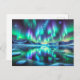 Upplev den häpnadsväckande skönheten hos nordliga ljus som dansar över natten himmel. Med det här vykortet fångas livfulla nyanser av grönt, blått och lila över ett serentäckt landskap som täcker snö. Auroran reflekterar i ett stillastående sjö och skapar ett mesmerierande och annat globalt glöd. Ett val av perfekt för stjärnazrar, resenärer och älskare av berömda underverk.