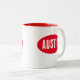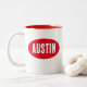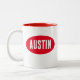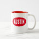 En röd Austin-design på en vit mugg. Austin, Texas huvudstad, är livskraftig och den stad i Förenade Stater som bäst vill bo i.
