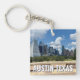 Denna moderna Austin Texas souvenir-nyckelring har vacker blå himmel och moln ovanför stadens siluett. Alla de nya byggnaderna mot de vackra gröna träden som förkroppsligar det urbana downtowns skönhet och platsens natur. Fantastiskt resminne som present till en besökare eller lokal Austin-bo som gillar att utforska Butler Park, Liz Carpenter splash pad och Auditorium Shores.