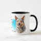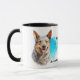 En vattendjup porträtt av en vacker australisk Hund i Cattle är utmärkande på två sidor av mugg. Varje bild placeras på en ljusblå stäng bakgrund. Mellan två bilder finns texten som beskriver detta lojala och modiga sällskap, med "AUSTRALIAN CATTLE-HUND" svart i grund. All text är lätt att anpassa till vad du vill, så att du kan anpassa den eller beskriva din egen hund.