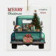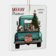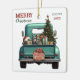 En tårblått pickup lastbil bär ett dekorerat Helgdag träd och presentat paket på denna söta julprydnad av glas. Tittar ut från skaften är en vacker svart och australisk Kelpie-hund. En rustik träskylt på stötfångaren säger "Julturen". Den röda och grönt stiliserade texten längst upp till lämnat står "GOD JUL", med ditt namn (eller hund) och året vid högerna. Båda sidor har samma bild.