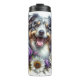 Ett vackert Australian shepherd med påfallande markeringar i färg och ett stort, glatt leende omges av ett pulserande och färgstarkt spektrum av solblommor, lila och vita daisy. Mjuka vattenfärger i stänk ökar den glädjande och konstnärliga kännedomen om detta vackra hund porträtt.