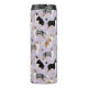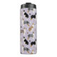 Cute Australian shepherd / Aussie hundar i svart, brun och mullig jackar sittande och stående utspridda hund ben och tass avtryck mot lätt lila.