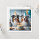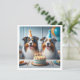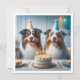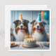 En riktigt söt inbjudan som visar 2 smarta australiensiska shepherdhundar med en födelsedagstårta och födelsedagshattar, en bra inbjudan för Australian shepherd- och hundälskare.