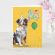 Konfettbitar, en ballong med grönt och färgstark text, allt på en djärv och glad gult-bakgrund, satte upp scenen för hund i Australian shepherd att skicka grattis på födelsedagen önskemål.