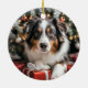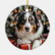 Denna berömvärda julprydnad med en tricolor Australian shepherd som ljuger under ett Julgran är en underbar gåva till vilken Aussie älskare som helst.