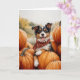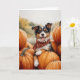 Det här hälsningskortet har en vattenfärg porträtt i Australian shepherd hund sitta på en pil med pumpor i ett pumpplåster.