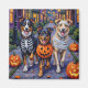 Australian shepherd som är klädd i lekfulla Halloween-kostymer bär pumpfickor medan man lurar eller behandlar under det månbelysta himmel. Denna festliga utformning belyser rasens flyktiga jackande, intelligenta ögon och lekfull personlighet, som perfekt fångar den förevändning som fortfarande finns i Halloween-natten i roligten. Ett härligt firande för hundälskare och Halloween fläkt.