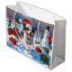 En helgdag med hjärtslitande hund i snö, som bär en julhatt och omges av färgfulla presentlådor. I bakgrunden bygger barn snögubbe bredvid ett Julgran som är täckt av snö och skapar en glatt vinter under. Perfekt för att sprida helgdag och fånga julens magi.