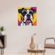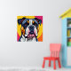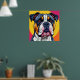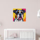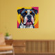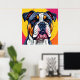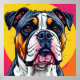 En livfullt illustrerad närbild av en bulldogs ansikte. Hunden har uttrycksfulla ögon och ett distinkt pälsmönster med djärva svarta, vita och tanfärgade nyanser, mot en ljus, abstrakt bakgrund av cirkulära former i rosa och gula nyanser.