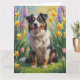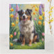 En glad hund sitter fridfullt på frodig grön gräsmatta, omgiven av färgrika vårblommor under en mjuk blå himmel. Denna digitala oljemålning fångar ett stillsamt ögonblick med uttrycksfulla penseldrag, varma färger och en känsla av mild glädje.