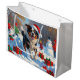 En helgdag med hjärtslitande hund i snö, som bär en julhatt och omges av färgfulla presentlådor. I bakgrunden bygger barn snögubbe bredvid ett Julgran som är täckt av snö och skapar en glatt vinter under. Perfekt för att sprida helgdag och fånga julens magi.