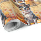 En vattenfärgsmålning stil av ett muntert sitta i hund i en hög av pulserande höst löv, omgiven av små pumpor och spridda hörn. Hund bär lite pilgrimhatt och beams med glädje, och fångade Thanksgivingens anda. I bakgrunden skapar mjuk skörd fält och träd med gyllene hud en fredlig landskapsambians. Struktur och varma, nedsmutsade hösttonar ge är en mysigt, nostalgisk perfekt för att fira säsongens skönhet.