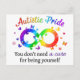 Färgfull oändlighetssymbol för det autistiska Pridet och budskapet "Du behöver inget botemedel för att vara dig själv" med vackra fjärilar, hjärtan och blommor. Det är en underbar gåva att fira Autistic Pride Day den 18 juni varje år.