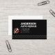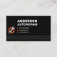 A professional business card in industrial aesthetic style with orange accent for auto repair activities featuring a wrench & gear icon, tire tread pattern.