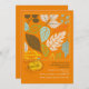 En ljusstark inbjudan och en inbjudan från lycklig höst-löv med löv i vitt, blått, gult, grönt och brunt mot orange. (Vecteezy.com - Vektormallar för sammansättningar och höstkort efter lyckmeluv).