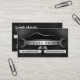 © Sunny Mars Design. Den svarta och vita mallen för visitkort för automatisk reparation innehåller en vektorillustration av silhuetten på en sportbil med en skiftnyckel eller skiftnyckel nedanför den, stoppade flaggor i kontrollkärna och bitumenväg med linjer. Profilkort för perfekt för automatiska reparationsverkstäder och mobila mekaniker.
