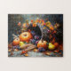 En pulserande målning av en kornuskopi som flödar över med pumpor, druvor, päron, vete och höst löv.