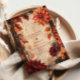 En romantisk höstdesign som innehåller rik dahlias i burgniga och brända orangar, omgivna av känsliga vindruvor och fallande löv. Med vintagens bakgrund frammanar den här utformningen värme, elegans och säsong charm - perfekt för ett fallbröllop med tidlös appell. Enkel personlig till kostym din firande.