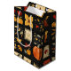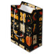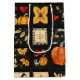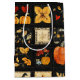 Den här presentpåsen visar en folkkonst quilt-stil-lappverk, fylld med gevärsmotiv och automotiv. I ett rutnät med kvadrater och rektanglar är det pumpor, fallande löv, fåglar, hjärtan och stjärnor, som alla återges i ett mysigt primitivt stil. Den varma jordens färg-palett av orange, brun, guld, svart, röd och grädde skapar en skördeinspirerad estetisk perfekt för höst, Thanksgiving, lantgårdsdécor och land som lever. Med synliga syskon och en homespun charm ger mönster det traditionella, handgjorda utseendet av rustik frälsning samtidigt som man firar årstidens omfattning.