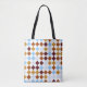 Den här bilden visningar en färgstark, upprepande diagonal mönster med alternerande färg - djup lila, magenta, orange, gult och oliv grönt - som ställs in mot en vit bakgrund. Rutorna är placerade i en diagonal, rutnätsliknande form som skapar en slående synlig påminnelse om klassisk harlequin eller vintage av textildesign