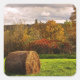 Dessa fotografiklistermärken på bran presenter är ett underbart höstlandskap i säsong faller på blad färg av rött, orange, gult, brun och grönt. En storm har passerat och sol bryter sig genom molnen på ett fält med egna hö med runda balar.