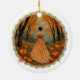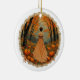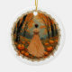 Beautiful ornament showcasing a woman in a flowing gown walking through a pumpkin-filled autumn forest, framed by a delicate lace doily. A perfect decorative piece that combines fall elegance with seasonal charm.