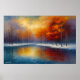 A serene lake reflects vibrant autumn trees and a colorful sky. The line of barren trees contrasts with fiery reds and oranges of fall foliage.