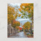 A street view of Stanford University in autumn. The road is wet, reflecting the sky and surrounding trees. Trees line both sides of the street, displaying vibrant fall colors of yellow, orange, and red. In the distance, the iconic Hoover Tower with its red-tiled roof is visible. The sky is overcast, creating a soft, diffused light.