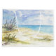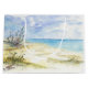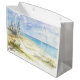 Vackra presentväskor med sjölandskap i imponerande vattenfärger. Blå himmel och karibiska blå hav tvättar på sandstränder.